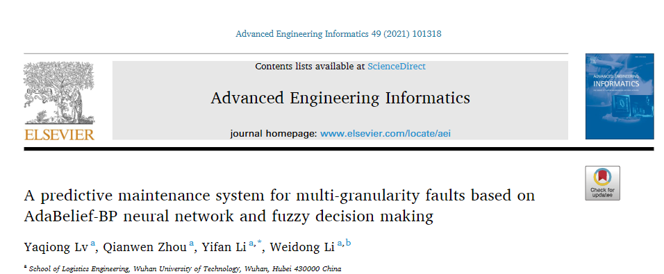我院吕雅琼副教授、李一凡博士合作撰写的学术论文“A predictive maintenance system for multi-granularity faults based on AdaBelief-BP neural network and fuzzy decision making”被工程领域国际权威期刊《Advanced Engineering Informatics》发表。该期刊位于JCR的Q1分区(10/90),2020年影响因子5.603,近五年影响因子5.936。