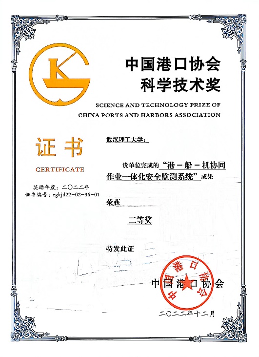 日前,由我院肖汉斌教授,徐承军、祝锋、董熙晨副教授等为主要完成人的项目——《港—船—机协同作业一体化安全监测系统》荣获2022年度中国港口协会科学技术奖二等奖。