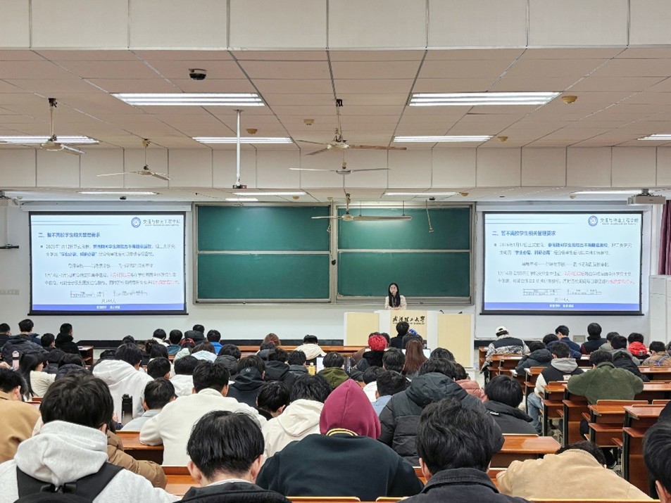 1月13日,欧美a片 在航海楼107举办寒假留校学生安全教育研学讲堂。本次讲堂由2025级研究生辅导员杜茜娅老师担任主讲人,全体留校研究生参与。