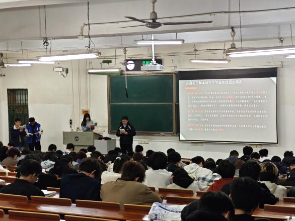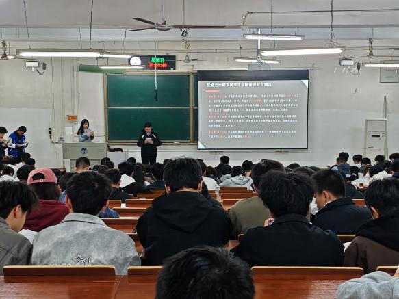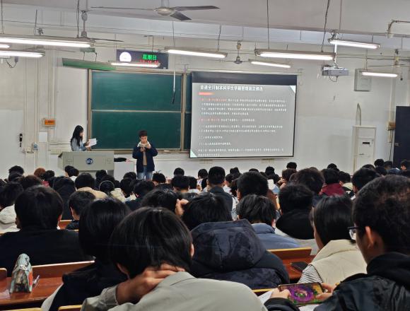 接着,孙老师围绕学业规划展开讲解,为同学们梳理大学学业的核心要点。针对日常学业,明确了课程出勤、学委考勤等基本要求;针对保研、学科竞赛等发展方向,提醒同学们以通知为准,提前做好准备;同时强调体育测试的重要性,杜绝作弊行为,引导学生重视身体素质提升。