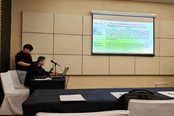 李文锋教授团队主要研究领域包括生产物流调度和物流装备自动化两大方向,此次会议中的多场主题报告均涉及AI技术引领下的智能制造和移动装备自动化,在李文锋教授的带领下,博士生张强积极参加了相关主题报告并在小组讨论中进行了题为“Port AGV Hierarchical Formation Control Considering High-Frequency Disturbance Factors”的口头报告,展示了团队的最新研究成果。