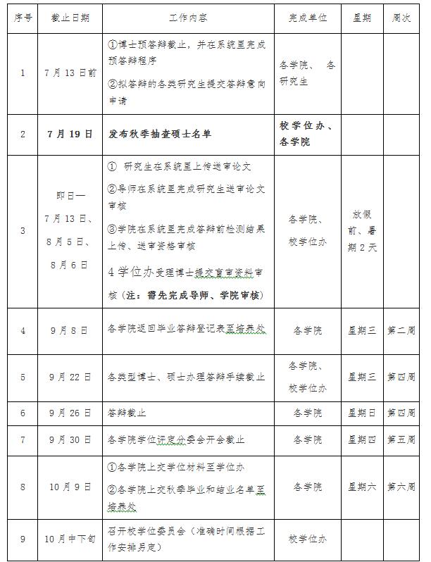 各类研究生答辩表决票盖章办理截止日期为2021年9月22日,答辩截止日期为2021年9月26日。各学位评定分委员会开会截止日期为2021年9月30日,各欧美a片报送学位材料及秋季毕业、结业名单截止日期为2021年10月9日,其中秋季毕业、结业名单报送至培养处。